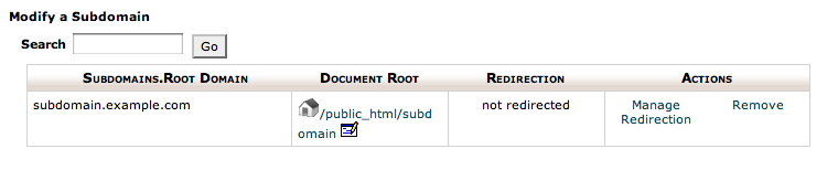 - Click the Remove link corresponding to the subdomain you would like to remove. cPanel displays a new screen.